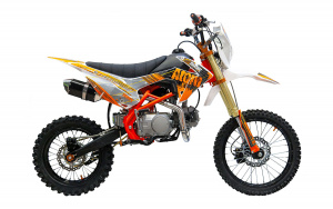 У питбайка классическая для своего класса размерность колес — 17/14. Гидравлическая дисковая тормозная система HSS Racing славится своей эффективностью, она оснащена армированными шлангами, а тормозной цилиндр – дополнительной защитой. Сзади устанавливается моноамортизатор с регулировкой преднатяга. Бугель в задней части придает жесткости конструкции. Благодаря яркой фаре головного света можно с комфортом кататься и в темное время с